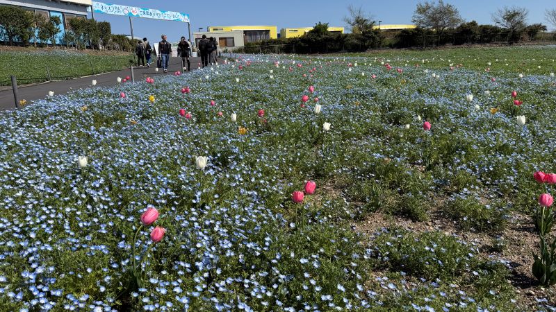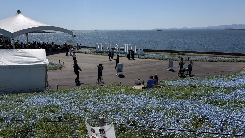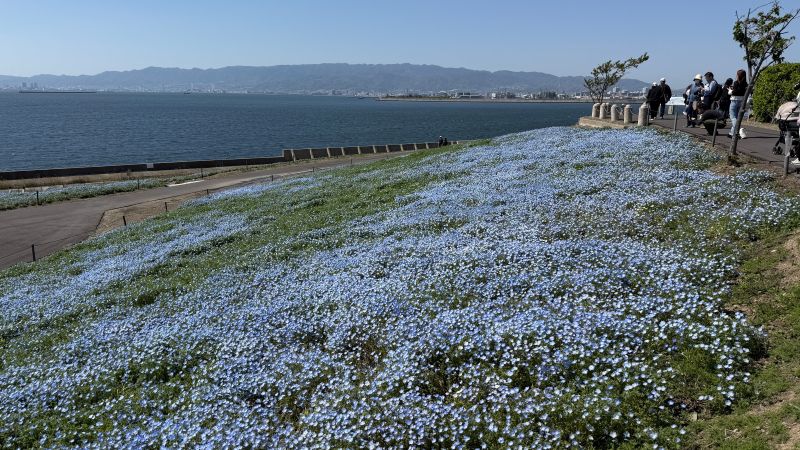 せっかく舞洲に来たので、近くで「ネモフィラ祭り」をしているというので行ってきました。入場料1800円のところ、お花がまだたくさんないので、1000円とのこと。お得でした。4/11ー5/10までやっているそうです。